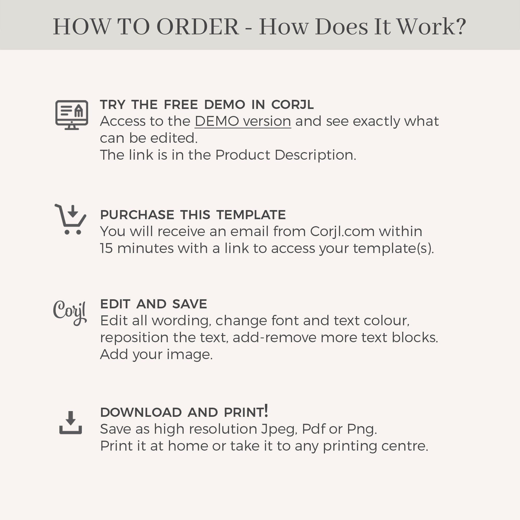 Corjl is a web-based editing platform that allows you to easily customize your template right in your browser—no software downloads required. You can even test your wording on a live demo before purchasing. Find the Demo Link below the product description to try it out.