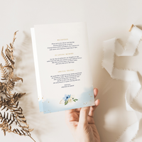 Guide your guests through the ceremony with a refined program that reflects your entire event theme. The dusty blue and white florals are elegant yet calming—perfect for a sophisticated, heartfelt celebration.