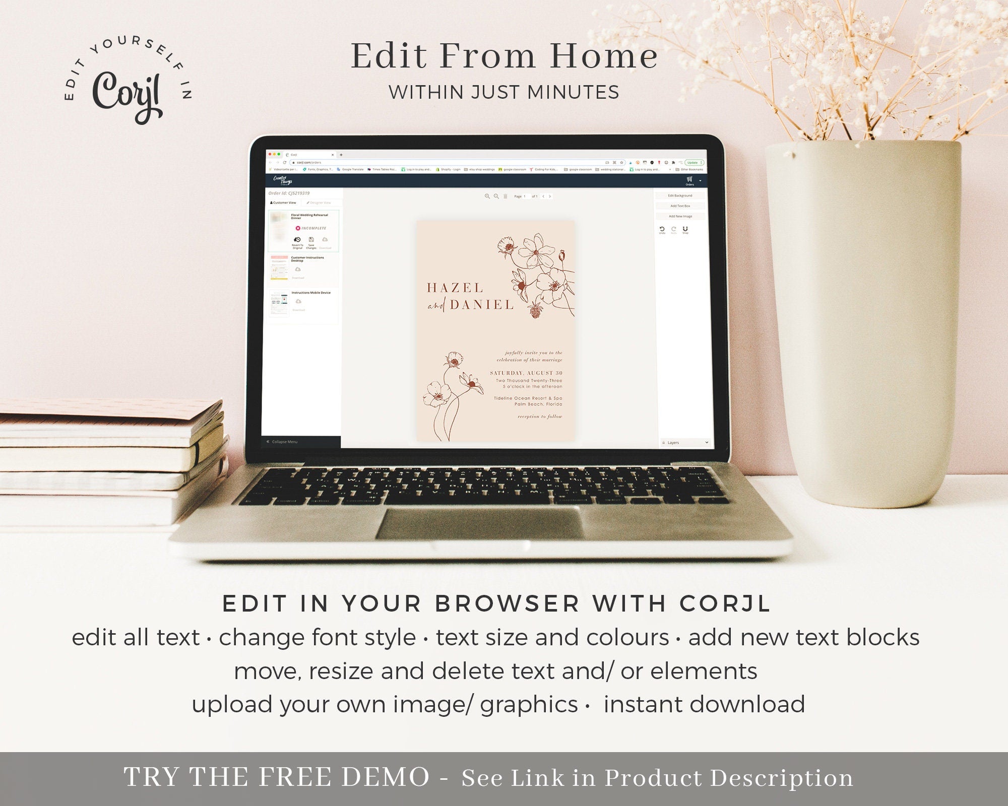 Corjl is a web-based editing platform that allows you to easily customize your template right in your browser—no software downloads required. You can even test your wording on a live demo before purchasing. Find the Demo Link below the product description to try it out.