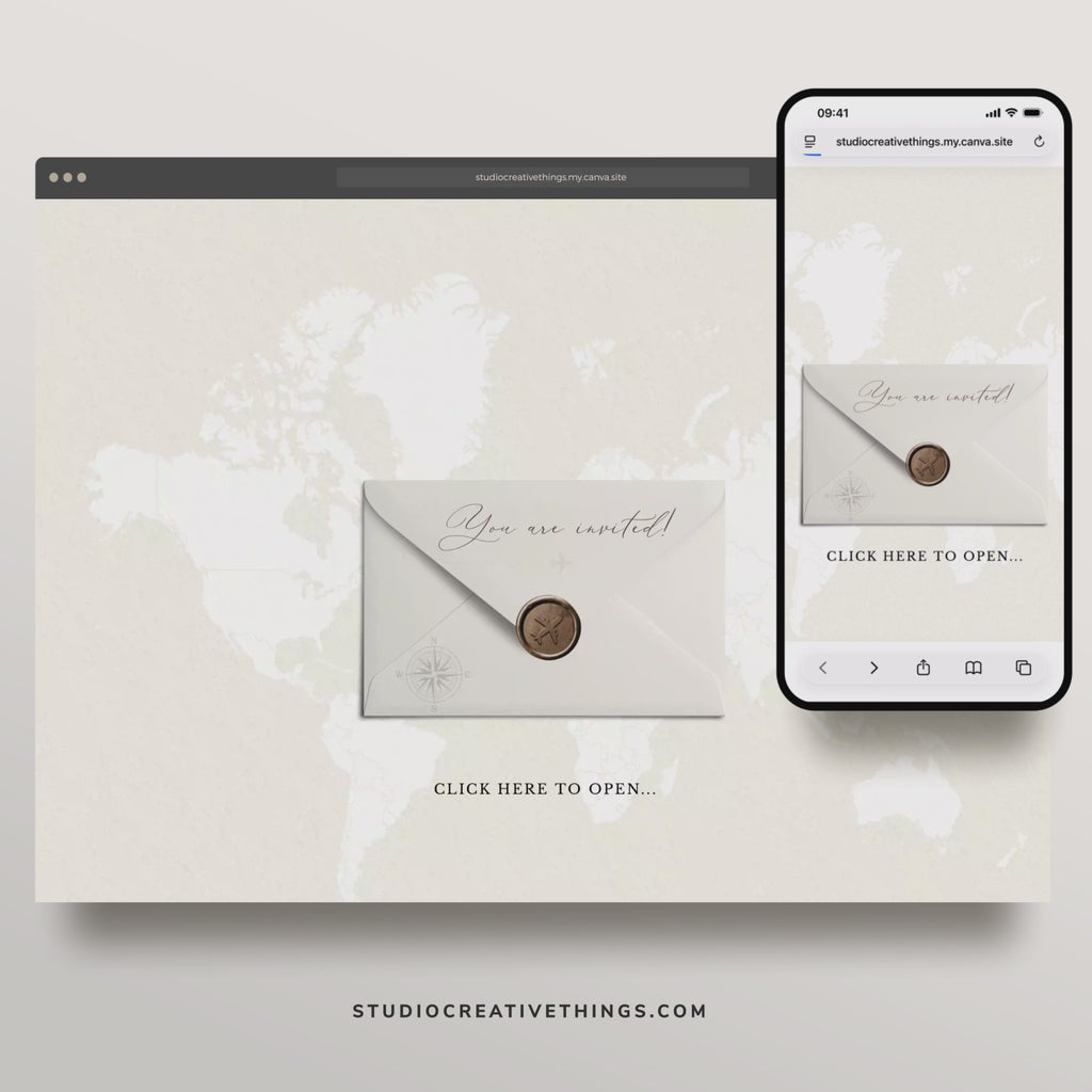 Guests are welcomed by an interactive envelope, which opens to reveal your main online wedding invitation. The homepage showcases your invitation design, followed by beautifully styled cards that guide guests to dedicated sections for wedding details, order of events, dress code, gift registry, and your RSVP page. A destination map element is included to visually highlight where your celebration will take place.